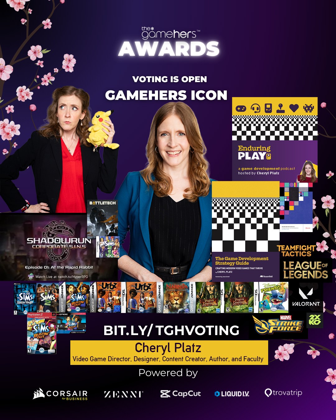 Cheryl Platz is deeply honored to be amongst the 2026 slate of nominees for the*gamehers GameHERS Icon this year: “Honoring talents, hosts, and public figures whose lasting influence has shaped gaming culture. This lifetime distinction celebrates those whose creativity, advocacy, and leadership have redefined what it means to make gaming a more inclusive and inspiring space.”